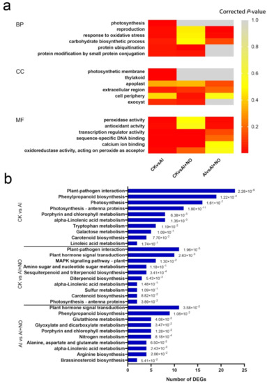 The transcript abundance of genes was measured in FPKM, and the DEGs were identified based on a false discovery rate (FDR) < 0.05 and |log2 (foldchange)| > 0. The three comparisons (CK vs. Al, Al vs. Al + NO, and CK vs. Al + NO) yielded a total of 1544 DEGs. A total of 1107 (388 upregulated and 719 downregulated) DEGs were identified between CK and Al datasets, while 511 (246 upregulated and 265 downregulated) DEGs were identified between Al and Al + NO datasets (Figure 6a,b).