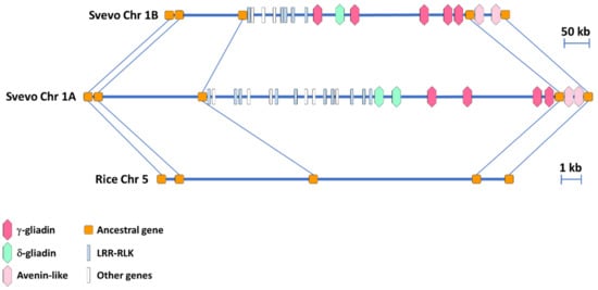 Synteny comparison between the two homoeologous regions of the A and B genomes of the durum wheat cv. Svevo harboring the γ-gliadin genes and the rice orthologous region. The five ancestral genes shared by rice and the durum wheat genomes are represented by orange squares and connected by lines. Hexagons with different colors represent different types of prolamins, leucine-rich repeat receptor-like protein kinases (LRR-RLK) are represented by light blue bars, whereas white bars represent all the other genes.