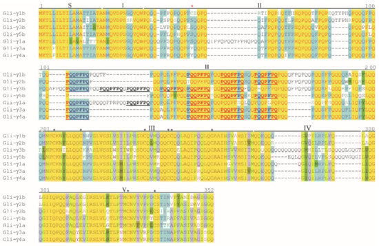 The length of γ-gliadin proteins encoded by the seven full-length genes ranged between 285 and 328 amino acids, whereas the molecular weight ranged between 32,666 and 37,446 Da (Table 3). As already described by Anderson et al. [31], the primary structure of γ-gliadins was composed of a signal peptide (S), a unique N-terminal region (domain I) followed by an alternation of two repetitive regions (domains II and IV) and two non-repetitive regions (domains III and V) (Figure 3). Domain II was rich in proline and glutamine and, in this region, the heptapeptide repeat motif PQQPFPQ typical of γ-gliadins [32] occurred 3–6 times. Domain IV contained tandem glutamine residues encoded by a series of glutamine CAA codons sometimes interrupted by codons such as CAG, GAA or CTA that derived from a single base mutation of the CAA codon (Figure S2a). The longest of this poly-Q sequence was in the Gli-γ3b (Figure 3).