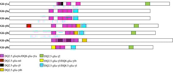 Due to the increasing evidence on the role of γ-gliadin epitopes in the development of CD, a bioinformatic analysis of the amino acid sequences was carried out to identify the type and distribution of CD epitopes in the γ-gliadins encoded by the seven full-length genes of the cv. Svevo. The results obtained are reported in Table 4 and schematically presented in Figure 4.