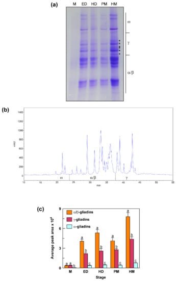 Accumulation pattern of gliadin proteins in seeds from the durum wheat cv. Svevo at different stages of development obtained by A-PAGE (a) and RP-HPLC (b,c). M, milk stage; ED, early dough stage; HD, hard dough stage; PM, physiological maturity stage; HM, harvest maturity stage. In (a) the bands corresponding to γ-gliadins are indicated with an asterisk. In (b) a typical RP-HPLC chromatogram obtained at harvest maturity is reported. In (c) the gliadin levels calculated using the area covered by specific gliadin groups on the RP-HPLC chromatogram are reported. Vertical bars represent the S.D. of the mean value of three independent experiments. For each stage, statistical differences are shown by different letters above columns (Tukey’s test, p ≤ 0.05).