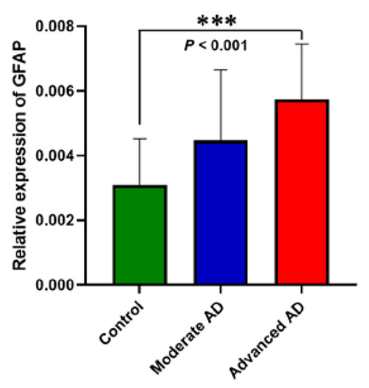 RNA expression of GFAP. Quantitative PCR analysis of GFAP expression relative to geometric mean of GAPDH and RPL13A housekeeping genes expression. Significant elevation of GFAP expression was observed in advanced AD (p < 0.001, 95% confidence interval= (0.85, 3.40)) but not in moderate AD (p = 0.557, 95% confidence interval = (−0.58, 1.97)). Control, n = 37; moderate AD, n = 39; advanced AD, n = 39. Data are presented as the mean ± SEM and analyzed by the one-way ANOVA test followed by the Dunnett post hoc test. *** p ≤ 0.001.