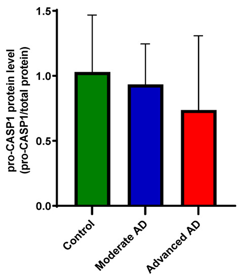 Protein expression of caspase-1. The detected pro-caspase-1 level was unchanged between groups (one-way ANOVA, F(2, 50) = 1.91, p = 1.58). Control, n = 17; moderate AD, n = 17; advanced AD, n = 19. Data are presented as the mean ± SD.
