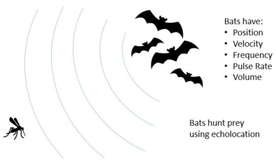 Visualization of the Bat Algorithm. The Bat Algorithm is inspired by the natural hunting behavior of bats. The algorithm captures this by giving each bat a the set of variables pictured on the right. These variables and their interaction are formalized in Section 2.2.