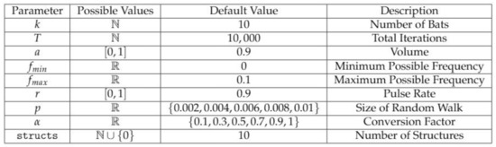 where L is the loss function defined in Equation (2). The conditions on whether a bat accepts its current solution are given in the top case of Equation (6) and can be interpreted as follows. For a solution to accepted, it must be a better solution than the currently accepted solution , that is, . Additionally, the bat’s volume a is used to introduce randomness in whether a bat accepts solutions frequently. From Equation (6), it can be observed that a high a means a bat will accept new solutions with high probability. The final step of the algorithm is to reapply Equation (7) to select the new global best solution . After all T iterations are complete, the algorithm terminates and returns .