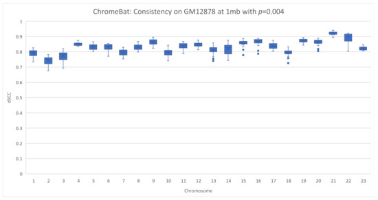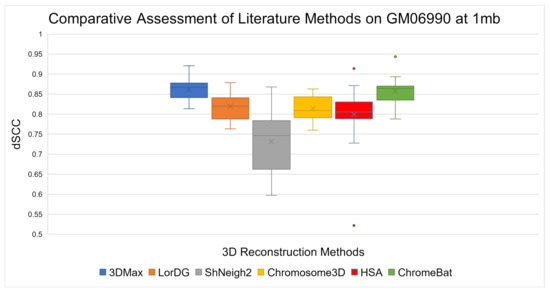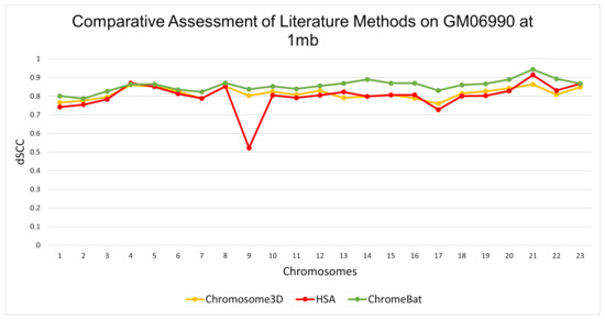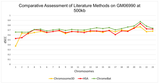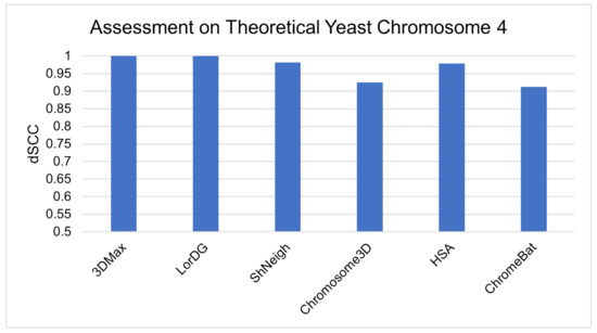 Finally, we evaluate ChromeBat and the literature methods on theoretical yeast chromosome 4 data [19,41]. The advantage of simulated data is that the ground truth is known [41]. Thus, our method’s ability to recreate real structures can be better assessed. The results can be observed in Figure 14, where all methods can be seen to have strong performance with >0.9 dSCC.
