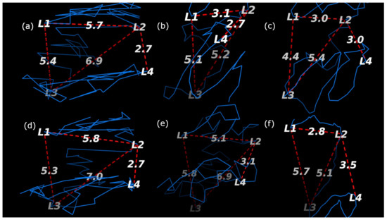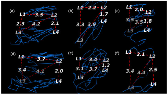 Fish Data Validation on Chromosome 14 from GM06990 litigated with HindIII at Resolution 1 mb. The blue line denotes the generated structure. The four probes (L1,L2,L3, and L4) from [5] are labeled on the chromosome, and the important distances between them have been labeled by red dashed lines. The methods used to generate each structure are as follows: (a) ChromeBat, (b) LorDG, (c) HSA, (d) 3DMax, (e) Chromosome3D, and (f) ShNeigh.