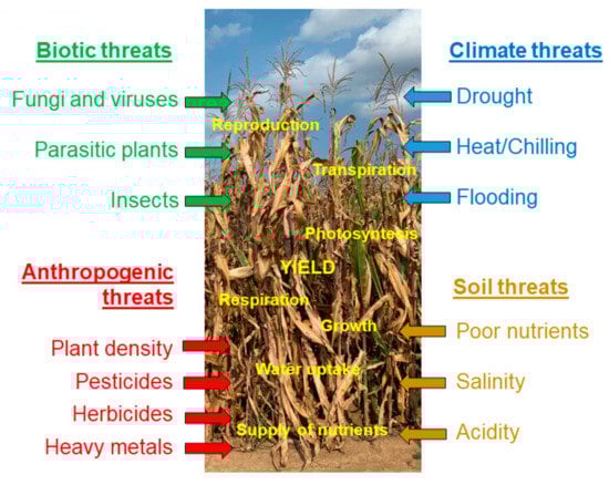Due to the complex interaction among different stresses, only a tiny fraction of studies on plant responses to stresses deals with the combinations of two or more stresses. A closer inspection of the database search revealed that only about 1% of the original articles had stress combination as a subject []. However, this could be changed due to extensive research on climate change and its multifactorial nature affecting unpredictable combinations of different stresses and posing an even greater threat to major crops []. Mittler [] proposed a stress matrix approach to visualize the individual positive and/or negative interactions among different stresses and their overall effect on plant growth and yield. At this two-dimensional level, the majority of the interactions among the stresses seem to be negative []. When more than two stress factors co-occur, a severe decline in the subsequent plant growth and survival takes place. Zandalinas et al. [] defined a multifactorial stress combination as a combination of three or more simultaneous stress factors grouping in the following four major threats: anthropogenic, biotic, climate and soil threats. The four threats that include agronomically important stress factors in maize are presented in Figure 1. They affect the supply of nutrients, water uptake, growth, respiration, photosynthesis, transpiration, reproduction of maize plant and, eventually, yield. Once additional stresses are presented, even at low levels, they could negatively interact with each other and bring about substantial decreases in agricultural productivity [].