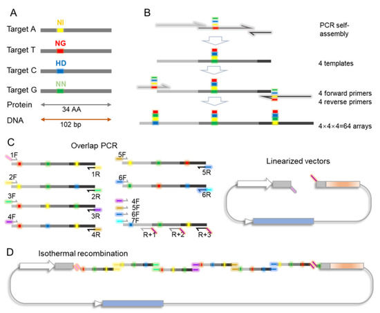 - Briggs, A.W.; Rios, X.; Chari, R.; Yang, L.; Zhang, F.; Mali, P.; Church, G.M. Iterative capped assembly: Rapid and scalable synthesis of repeat-module DNA such as TAL effectors from individual monomers. Nucleic Acids Res. 2012, 40, e117. [Google Scholar] [CrossRef] [PubMed] [Green Version]
