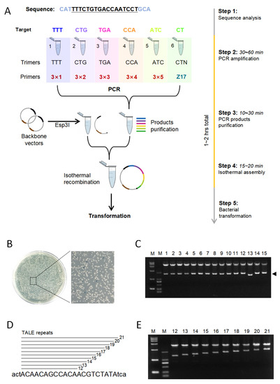 - Schmid-Burgk, J.L.; Schmidt, T.; Kaiser, V.; Honing, K.; Hornung, V. A ligation-independent cloning technique for high-throughput assembly of transcription activator-like effector genes. Nat. Biotechnol. 2013, 31, 76–81. [Google Scholar] [CrossRef] [PubMed] [Green Version]