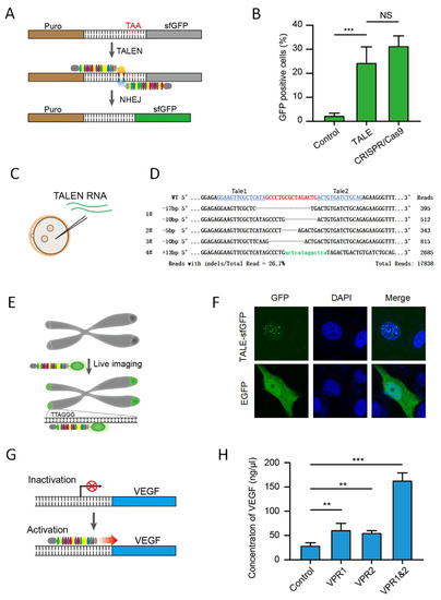 HEK293T and U2OS cell lines were grown in Dulbecco’s Modified Eagle’s medium supplemented with 10% fetal bovine serum. HEK293T and U2OS cells were transfected by using Lipofectamine™ 3000 Transfection Reagent (Thermo, Shanghai, China). TALENs were used to target the AAVS1 site of the HEK293T cells, and TALE-EGFP was applied to target the telomerases of the U2OS cells. TALE-VPR was targeted the promoter of the endogenous vascular endothelial growth factor (VEGF) gene of the HEK293T cells. The experiment was conducted in accordance with the manufacturer’s instructions.