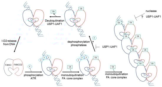 A reconstituted in vitro I-D2 monoubiqutination and deubiquitination using purified proteins has been advanced in this decade, using the FANCL protein alone in the whole FA core complex as an E3 ligase [22,23,24,25,26]. FANCD2 monoubiqutination is greatly stimulated by the addition of FANCI and DNA [22,23]. For deubiquitination, USP1-UAF1 could efficiently remove ubiquitin from FANCD2-Ubi–FANCI, but not FANCD2-Ubi–FANCI-Ubi [21]. When FANCD2-Ubi–FANCI-Ubi is dissociated from the DNA, USP1-UAF1 removes ubiquitin from FANCD2-Ubi–FANCI-Ubi [25]. Thus, functional significance must exist between FANCD2-Ubi–FANCI-Ubi and FANCD2-Ubi–FANCI on DNA (see below).