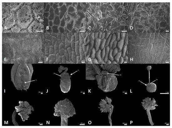 The hypanthium and stigma characteristics were helpful for the identification of the Sanguisorba species. Four Sanguisorba species could be distinguished into two groups based on the shape of the hypanthium: ellipsoid and globose. This pattern is consistent with the observations of Wang et al. [19] for S. tenuifolia var. alba (their Figure 3), S. hakusanensis (their Figure 7E), and S. officinalis (their Figure 9). However, the disk-like structures and style shapes were not consistent. The degree of development of the disk-like structure was different for S. tenuifolia (Figure 1L) and S. tenuifolia var. alba (Figure 4F). S. tenuifolia var. alba had a thickened disk-like structure, unlike that of S. tenuifolia. To confirm their taxonomic usefulness, research that covers all species is required. Although almost all samples collected at anthesis were observed in the bent style, some flowers of the same individual had a straight style. Thus, this feature was inconsistent and unusable for identification. All the Sanguisorba species have a fimbriate stigma [4,5,6,7,8]; however, their fimbriae lobation and apex shape differed. The stigma surface area is closely related to the pollination mechanisms and efficiency [59]. Thus, a more detailed correlation between the stigma receptivity, different shapes, and surface areas and their pollination efficiency in this genus is required.