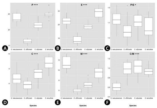 The quantitative data of the pollen morphological characteristics in Sanguisorba species. Boxplots show the median, 25th and 75th percentiles (box), 10th and 90th percentiles (whiskers), and outliers (closed circle). (A) Polar axis (P, μm), (B) Equatorial diameter (E, μm), (C) P/E, (D) Colpus width (C, μm), (E) Mesocolpus width (M, μm), (F) C/M. The difference of characteristics is marked as significant with an asterisk based on an analysis of variance (ANOVA) test (*; p < 0.05; ***; p < 0.001).