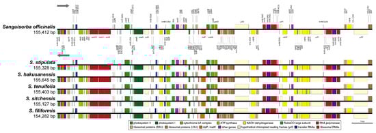 The linear gene map of the chloroplast genomes from the six Sanguisorba species. Genes are transcribed left to right. Genes above the line are positioned in the forward direction (left to right). Genes below the line are positioned in the reverse direction (left to right).