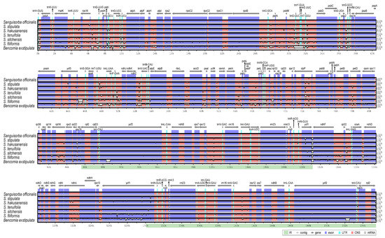 Comparison of the Sanguisorba chloroplast genomes using mVISTA. The complete cp genomes of six Sanguisorba species and Bencomia exstipulata were compared, with S. officinalis as a reference. Blue block: conserved genes, sky-blue block: transfer RNA (tRNA) and ribosomal RNA (rRNA), red block: conserved non-coding sequences (CNS). White represents the regions with sequence variation among the six Sanguisorba and Bencomia exstipulata.