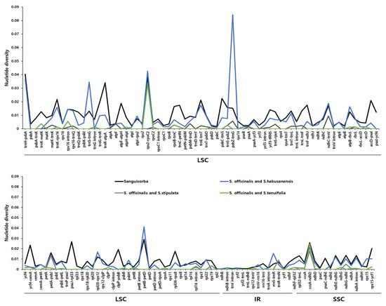 Comparison of the nucleotide diversity (Pi) values among the Sanguisorba. Pi value of Six Sanguisorba is indicated using a black line.