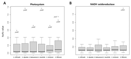 Ka/Ks values for (A) the photosystem- and (B) NADH oxidoreductase-related genes in the Sanguisorba cp genomes.