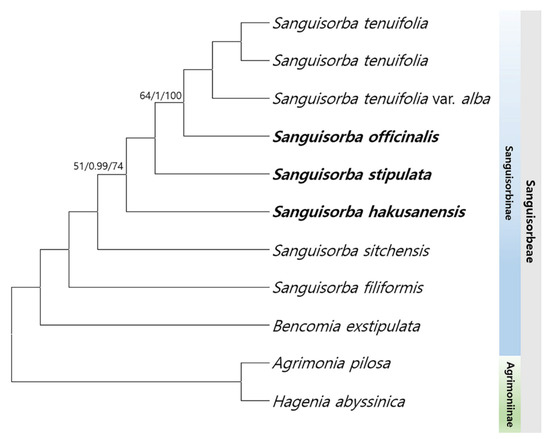 A total of 11 cp genomes, nine from Sanguisorbinae along with Agrimonia pilosa and Hagenia abyssinica as outgroups, were used for phylogenetic analysis. Of these, eight cp genome sequences were downloaded from the NCBI GenBank database (Table S10). We used two matrices composed of 77 conserved protein-coding genes (CDSs). Using MAFFT ver. 7.388 [118], the CDS sets were aligned. Each aligned gene was extracted using the Geneious software (https://www.geneious.com, accessed on 20 March 2021), and the genes were arranged alphabetically. The concatenated gene dataset was created using the Geneious software and the CDS dataset. The alignment datasets were filtered to remove ambiguously aligned regions using Gblocks ver. 5 [119]. The best-fitting model of nucleotide substitutions was determined using the Akaike information criterion in jModelTest V2.1.10 [120] (Table S11), and the GTR + I + G model was chosen for ML analysis. The GTR + G model was selected for analyzing the BI. The maximum parsimony (MP) analysis was conducted using the PAUP v4.0b10 [121]. The MP searches included 1000 random addition replicates and TBR branch swapping with the MulTrees option. The ML analysis was performed using RaxML v. 8.0.5 [122] with 1000 bootstrap replicates. The BI analysis was carried out using MrBayes 3.2.2 [123], with two independent runs of four simultaneous chains, executed for 5,000,000 generations using the Markov chain Monte Carlo algorithm. Trees were sampled every 5000 generations, and the first 25% were discarded as burn-in. The trees were determined from a 50% majority-rule consensus to estimate the posterior probabilities. The reconstructed trees were visualized using Figtree V.1.4.2 [124].