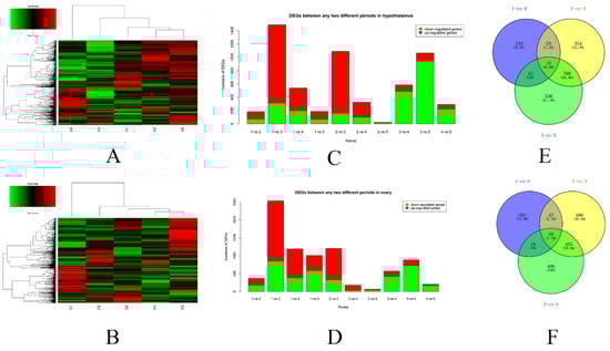 Transcriptome analysis of hypothalamus and ovary in 5 periods during FM. Overall profiles of mRNA expression in the hypothalamus (A) and ovary (B). DEGs between any two different periods in the hypothalamus (C) and ovary (D). Venn diagram shows the DEGs from the 1-vs-2, 2-vs-3, and 3-vs-5 comparisons in the hypothalamus (E) and ovary (F).