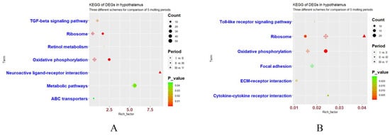 The KEGG pathways of three groups of DEGs in hypothalamus and ovary during FM. Significant KEGG pathways of DEGs (p < 0.05) from the comparison of Ⅰ vs. Ⅱ, Ⅱ vs. Ⅲ, and Ⅲ vs. Ⅴ in the hypothalamus (A) and ovary (B).