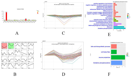 Genes in profile 1 were associated with 16 GO terms, such as extraocular skeletal muscle development, hypothalamic cell migration, and positive regulation of cell division. KEGG pathways were enriched only for oxidative phosphorylation and ribosomes (Figure 4E). However, there were only three significant GO terms (bile acid biosynthetic process, neuron projection, and cell body fiber) and one KEGG pathway (oxidative phosphorylation) enriched in genes of profile 13 (Figure 4F).