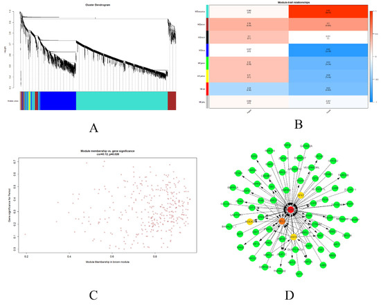 We only focused on changes in gene expression during five periods of FM. Modules with common expression patterns in interaction analysis of coexpression modules associated with specific traits (module–trait) were identified based on the correlation between module eigengenes and phenotypic traits. The correlation of modules and traits related to the five periods (module–trait) showed that some modules were more important than others in the periods. The brown-colored module had the greatest association with period traits (Figure 5B). Therefore, the brown module, including 342 genes, should be captured, and it summarized the most mRNA expression profiles. Scatter diagrams of gene significance for period vs. module membership in the brown modules were plotted (Figure 5C), which exhibited the significance of the genes in the brown module relative to different periods (p = 0.026).