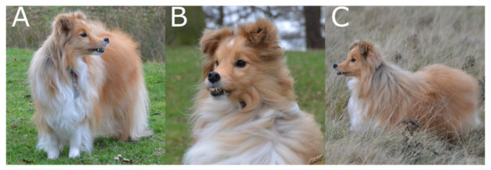 Proband SS1 showed uncharacteristic features for the breed, including an upturned nose, an abnormal coat of a wavy texture and dental abnormalities (Figure 1). These features became increasingly noticeable as the dog developed, becoming more apparent around the age of six months. Veterinary history also noted dental remarks where multiple teeth were extracted at the age of 11.9 years as lower incisors were loose. No further information on the physical appearance of proband SS2 was available, although the dog was reported to have undergone dental treatment of three teeth extractions due to resorptive lesions. Similarly, no further information was available on the physical appearance of proband SS3. Photographs of both sire and dam show they did not exhibit the unusual nose shape or coat texture observed in the affected offspring.