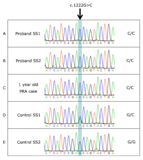 Sanger sequencing of the BBS2 c.1222G>C variant confirmed its presence in proband SS1 (track (A)). Additional dogs were also homozygous for the c.1222G>C variant (tracks (B,C)). SSs heterozygous for the variant and homozygous for the wild-type allele (G/G) are shown in tracks (D) and (E), respectively.