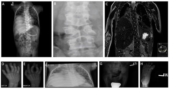 Nerve conduction study (NCS) was unremarkable. Electromyography showed myopathic changes in the tibialis anterior and vastus lateralis muscles. His skeletal survey revealed mild right convex scoliosis in the dorsal spine and butterfly vertebrae in the dorsal and lumber vertebra (Figure 3A–C). Flexion deformity in the fingers is noted, especially the ring and middle fingers of both hands involves the proximal interphalangeal joints (Figure 3D,E). Elevation of the right hemidiaphragm is noted with atelectasis in the right lower lobe and bronchiectasis in both lower lobes with average heart size (Figure 3F). There is left developmental dysplasia of the hip (Figure 3G) and hypoplasia of the proximal phalanx of the left big toe with subluxation of the left first metatarsophalangeal joints on the left side (Figure 3H). Renal ultrasound revealed bilateral nephrolithiasis.