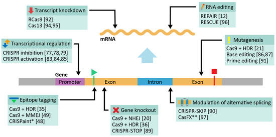Providing a comprehensive survey of functionality of all available CRISPR-Cas technologies lies outside of the scope of the present work and information about additional CRISPR-Cas systems can be found in other excellent reviews [19,81,86]. All previously discussed systems, however, can be ultimately applied to studying protein function in combination with the methods of proteomics, which is the focus of this review. A schematic illustration of the most common applications of relevant CRISPR-Cas systems to genome and transcriptome editing is provided in Figure 1.