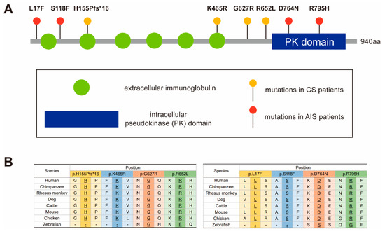 Figure 1. Mapping and conservation analysis of the identified variants. (A) Mapping of eight PTK7 variants revealed that p.L17F, p.S118F, p.H155Pfs*16 and p.K465R are located in the extracellular region of PTK7 protein. p.D764N and p.R795H are located in the intracellular pseudokinase domain. (B) The conservation of variants in human and other vertebrate species.