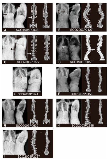 Figure 2. Antero-posterior, lateral spinal X-ray and the spinal three-dimensional CT reconstruction of patient SCO1905P0038 (A), SCO2003P2127 (B), SCO2003P0372 (C), SCO1908P0053 (D), SCO1907P0150 (F), SCO2003P0632 (G), SCO2003P2288 (H), SCO2003P2237 (I). Antero-posterior, lateral spinal X-ray of patient SCO2003P0541 (E). Arrowheads point to the vertebral or rib deformities.