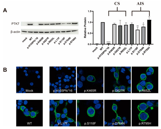 To identify the influence of the identified variants on PTK7 protein function, we evaluated overall protein expression and sub-cellular location of the variants of PTK7 compared to the WT. Western blotting analysis identified the immunoreactive-specific band for flag-tagged WT PTK7 at 150kDa and β-actin at 42kDa. The overall expression level was quantified by estimating bands from PNGase-treated samples and normalizing to WT. As anticipated, the overall expression of the frameshift variant (c.464_465delAC, p.H155Pfs*16) was significantly decreased compared to that of WT (p < 0.0001) (Figure 3A), indicating the loss-of-function effect of this variant. The expression level of two missense variants (p.S118F and p.D764N) were partially reduced (p = 0.0061 and p = 0.0293, respectively) (Figure 3A). Interestingly, these two variants were both identified in patients with AIS but not CS. There were no significant differences in the overall protein expression of the other missense variants (p.K465R, p.G627R, p.R562L, p.L17F, p.R795H) compared with the WT.