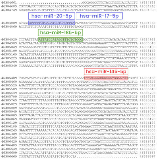 According to the miRTarBase, EPAS1 mRNA has been experimentally confirmed to be targeted by 13 microRNAs (miRNA) in humans [23]. Among them, four miRNAs hsa-miR-185-5p, hsa-miR-145-5p, hsa-miR-20a-5p, and hsa-miR-17-5p have strong evidence of binding to the EPAS1 mRNA, which is supported by reporter assays, western blot (WB), or quantitative PCR (qPCR) methods (Table 2). From the publications, we retrieved the target sites of those four miRNAs and marked them on the EPAS1 3′UTR region (Figure 4).