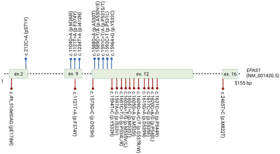 Based on the OMIM and Simple ClinVar databases, EPAS1 is broadly associated with Familial erythrocytosis type 4 (ECYT4), a congenital disease with an excessive erythrocytes mass, elevated hemoglobin, and/or hematocrit. The review of the literature revealed 20 variants in the EPAS1 gene associated with erythrocytosis; 19 missense substitutions, and one deletion in exons 2, 9, 12, and 16 [77] (Figure 7). However, in the database Global Variome shared LOVD, currently, only seven variants c.1601C>T, c.1603A>G, c.1604T>C, c.1609G>T, c.1609G>A, c.1617C>G, c.1620C>G are listed as pathogenic for ECYT4 [28].