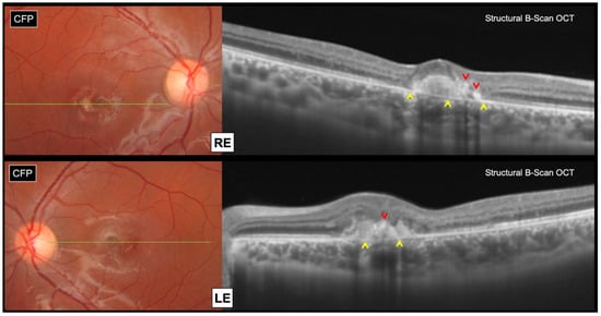 Swept source structural optical coherence tomography (OCT) (Topcon, DRI OCT Triton, Tokyo, Japan) revealed bilateral subretinal hyperreflective lesions, associated with focal areas of outer retinal atrophy and intraretinal pigment migration, without any subretinal fluid accumulation (Figure 2).