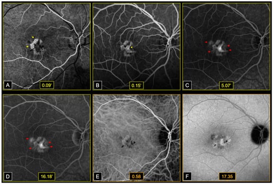Dye angiography of macular fibrotic lesion and perifoveal telangiectasia in the RE. (A,B)—Early phases FA: Window defects at the level of areas of atrophy (yellow arrows—A), followed by dye filling of the central fibrotic lesion (yellow arrowheads—B). (C,D)—Late phases FA: Perifoveal capillary dye leakage (red arrows). (E,F)—Early and late phase ICGA: Speckled appearance of the macula. Heterogenous areas of hypo and hyperfluorescence.