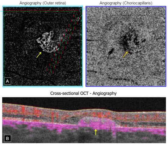 Swept source OCT-Angiography of CNV in the RE. (A)—En face OCT-A (3 × 3 mm): Well-defined high-flow vascular network at the level of the OR slab (yellow arrow) with a projection in the CC slab (orange arrow). (B)—Cross-sectional OCT-A: High-flow signal within subretinal hyper-reflective lesion (yellow arrow).