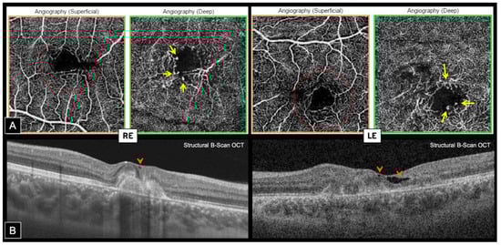 Swept source OCT and OCT-Angiography of macular telangiectasia in both eyes. (A)—En face OCT-A (3 × 3 mm): Perifoveal tortuous capillaries and vascular voids in the SCP (red circle). Perifoveal markedly dilated telangiectatic and rarified capillaries in the DCP (yellow arrows). Distorted FAZ in both SCP and DCP. Vascular anomalies are mainly temporal in the RE and more circumferential in the LE. (B)—Structural B-Scan OCT: Hyporeflective cystic cavities within inner foveal layers (orange arrowheads), around areas of vascular anomalies.