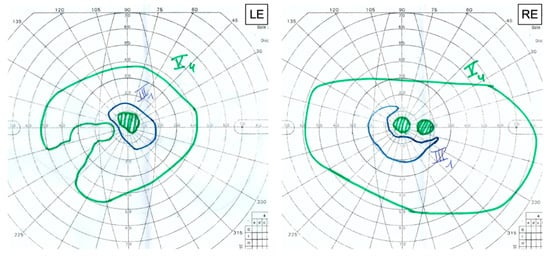 Goldmann visual field (GVF) revealed reduced isopters associated with central scotomas in both eyes. We noted an enlarged blind spot associated with a temporal superior defect with exclusion of the blind spot and the central field in the RE and an exclusion of the blind spot in the LE (Figure 6).