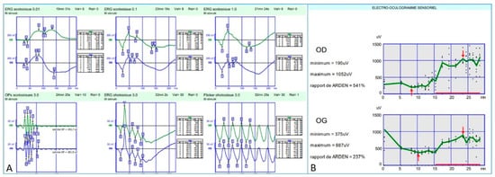 Electro-oculogram (EOG) (Metrovision, Perenchies, France) revealed an Arden ratio within normal limits in both eyes (Figure 7B).