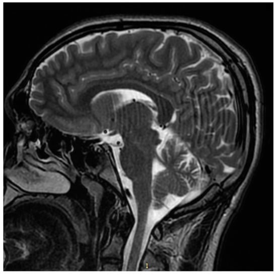 Brain MRI—Sagittal T2-weighted section. Normal brain imaging.
