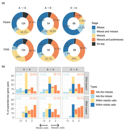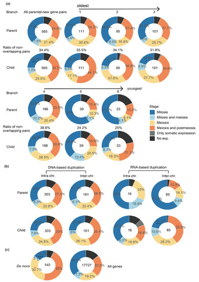 To measure the stage shift between the new and parental genes, we proposed a calculation method. From spermatogonia to spermatids, corresponding to numbers 1 to 4, the difference between child value and parent value is the pairs’ stage shift condition. The negative number means the child stage is before the parent stage, and a positive number means the child stage is after the parent stage, thus we obtained a value by which to measure the stage shift condition. All the significant tests in main figures were performed using the Fisher test in R (Table S2). For duplicated new genes, the tests were checked between parent and child. For de novo new genes, the tests were checked between de novo new genes and all annotated genes. We used Flybase (http://flybase.org/, accessed on 4 May 2021) to manually check individual genes’ expression patterns across different tissues or stages, based on the modENCODE transcriptome data [54,55].