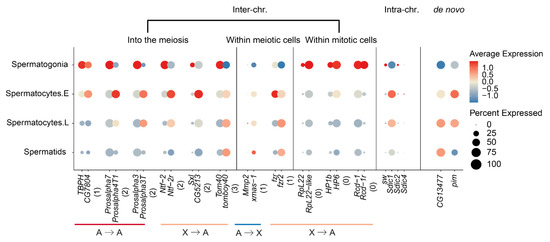 Previous studies of new genes used the whole-testis RNA-seq [19,20], or different manually dissected parts of Drosophila testis that are enriched for different stages of cells in spermatogenesis for microarray [21]. Direct cell-level evidence for MSCI driving the new gene out of the X chromosome is still lacking. In addition, debates about whether there is MSCI in Drosophila [22,23] have lasted until very recently. A new single-cell RNA-seq (scRNA-seq) study of larvae testes of D. melanogaster provided novel cell-level expression evidence and resolution of distinctive nuclear features of X chromosome vs. autosomes that supported the existence of MSCI of some but not all X-linked genes [24]. This study also uncovered that the gene-poor dot chromosome, a former X chromosome in non-Drosophila Diptera species [25], exhibited a similar dynamic expression pattern with that of X chromosome during spermatogenesis, probably due to their close nuclear territory that subjects them to the same regulatory program. Another scRNA-seq of adult testes found that de novo genes, which originated from non-coding DNA sequences, showed a distinct cell type distribution across expressed testis cell types between segregating vs. fixed de novo genes [26]. This work revealed a dynamic cell-level expression pattern of X-linked genes vs. autosomal genes, or that of de novo genes vs. other genes in the testes; and also offered a great resource to re-examine several hypotheses regarding the new gene evolution in testes which previously cannot be precisely addressed due to the relatively lower resolution of bulk RNA-seq or microarray data. Here, we reanalyze the testis scRNA-seq data, with the focus on comparing the expressed cell types or stages during spermatogenesis between the new gene and its parental gene. Our aim is to reveal how the age, origination mechanisms, and chromosome location impact the evolution of new genes across different testis cell types. Specifically, if MSCI exists in Drosophila and drives the relocation of X-borne new genes onto the autosomes, we would expect that a shift of autosomal new genes to be expressed toward the middle or late spermatogenesis (e.g., in spermatocytes or spermatids after spermatogenesis enters meiosis) stages, relative to their parental genes that are expressed in the early spermatogenesis (mitotic) stage (e.g., spermatogonia). Test of this hypothesis is to provide mounting evidence for MSCI in Drosophila, and provide more insights into the molecular driving forces of new gene evolution in testes.