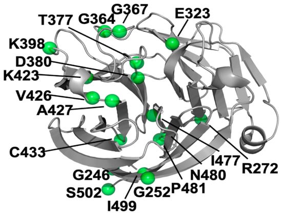 Cartoon structure of the OLF domain of myocilin. The amino acids with known mutations used for statistical analysis are shown as green balls.