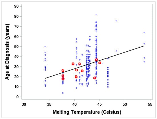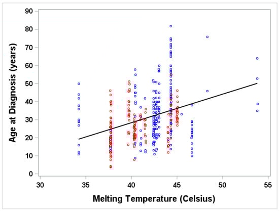 Age at diagnosis vs melting temperature, using randomly generated data points according to literature with summary statistics. Age for those with known individual ages (blue) and those with unknown individual ages (red) whose ages were imputed by a value randomly drawn from a Gaussian distribution with known mean age and standard deviation, SD, (SD was calculated as [maximum age–minimum age]/4 if SD was not given) and truncated by the given range. Pearson correlation coefficient between age of diagnosis and melting temperature is 0.34489. Linear regression of age of diagnosis (Age) on melting temperature (MT) is Age = −34.82 + 1.58 × MT (p < 0.0001); R-squared = 0.119; n = 458.