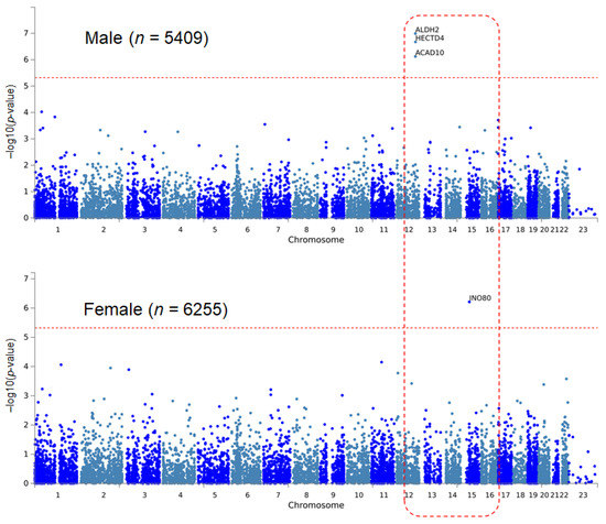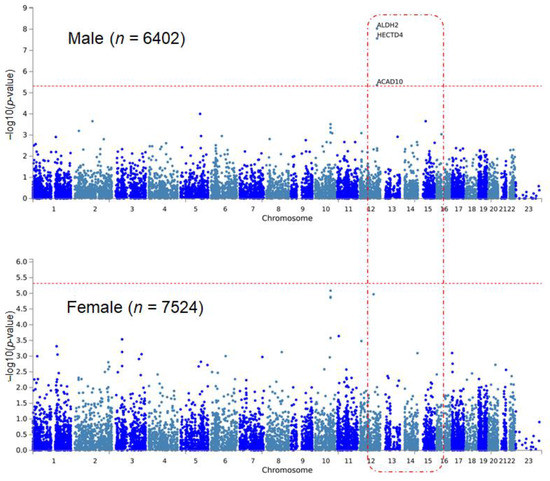 Manhattan plots of sex-stratified MAGMA analysis for hypertension. The Y-axis indicates −log10 (p-values), where p-values come from MAGMA analysis. Note that ALDH2, HECTD4, and ACAD10 are significant only in the male population. The red horizontal dotted line indicates the cutoff threshold for statistical significance.