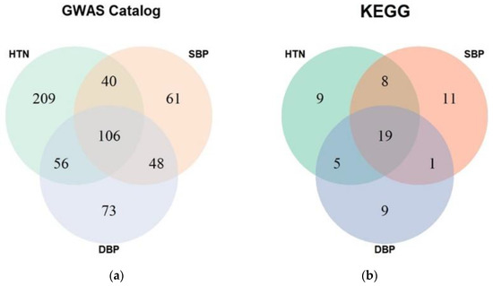 Venn diagrams of results from enrichment analysis with different phenotypes. The numbers indicate common gene sets occurring in results of different phenotypes. (a) GWAS catalog gene set, (b) KEGG pathway gene set. HTN, hypertension; SBP, systolic blood pressure; DBP, diastolic blood pressure; GWAS, genome-wide association study; KEGG, Kyoto Encyclopedia of Genes and Genomes.