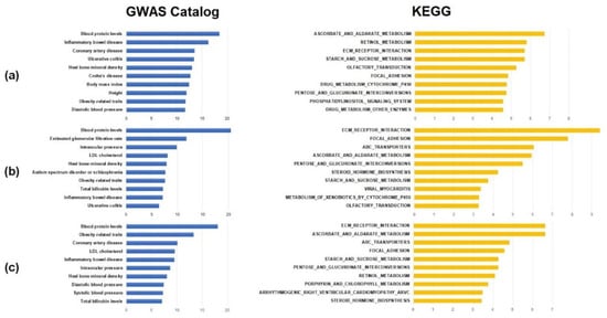 Top 10 results of functional enrichment test with GWAS catalog and KEGG pathway gene sets. The x-axis indicates −log10 (p-value of enrichment). In the (a–c), results from hypertension, systolic blood pressure, and diastolic blood pressure are listed, respectively.